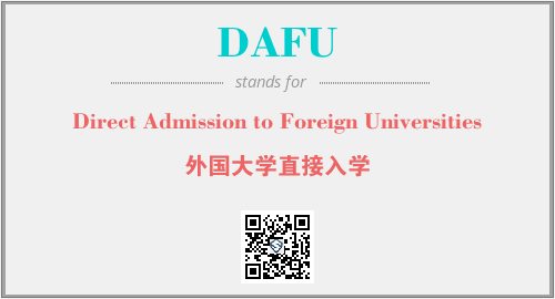 上述内容是“Direct Admission to Foreign Universities”作为“DAFU”的缩写,解释为“外国大学直接入学”时的信息,以及英文缩略词DAFU所代表的英文单词,其对应的中文拼音、详细解释以及在英文中的流行度和相关分类、应用领域及应用示例等。