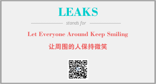 上述内容是“Let Everyone Around Keep Smiling”作为“LEAKS”的缩写,解释为“让周围的人保持微笑”时的信息,以及英文缩略词LEAKS所代表的英文单词,其对应的中文拼音、详细解释以及在英文中的流行度和相关分类、应用领域及应用示例等。