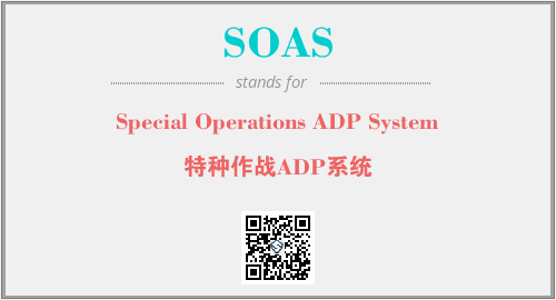 英文缩略词“SOAS”经常作为“Special Operations ADP System”的英文缩写来使用,中文表示:“特种作战ADP系统”。本文将详细介绍英文缩写词SOAS所代表英文单词,其对应的中文拼音、详细解释以及在英语中的流行度。此外,还有关于缩略词SOAS的分类、应用领域及相关应用示例等。