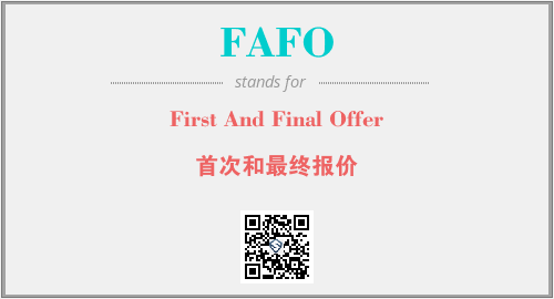 英文缩略词“FAFO”经常作为“First And Final Offer”的英文缩写来使用,中文表示:“首次和最终报价”。本文将详细介绍英文缩写词FAFO所代表英文单词,其对应的中文拼音、详细解释以及在英语中的流行度。此外,还有关于缩略词FAFO的分类、应用领域及相关应用示例等。