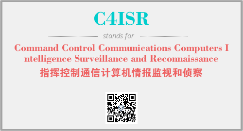 上述内容是“Command Control Communications Computers Intelligence Surveillance and Reconnaissance”作为“C4ISR”的缩写,解释为“指挥控制通信计算机情报监视和侦察”时的信息,以及英文缩略词C4ISR所代表的英文单词,其对应的中文拼音、详细解释以及在英文中的流行度和相关分类、应用领域及应用示例等。