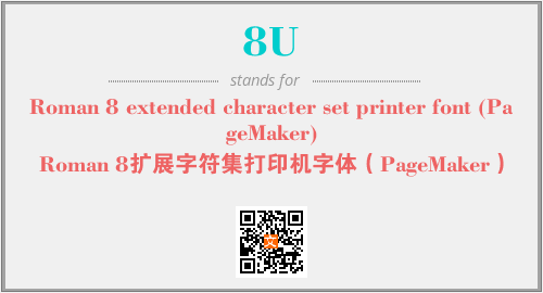 上述内容是“Roman 8 extended character set printer font (PageMaker)”作为“8U”的缩写,解释为“Roman 8扩展字符集打印机字体(PageMaker)”时的信息,以及英文缩略词8U所代表的英文单词,其对应的中文拼音、详细解释以及在英文中的流行度和相关分类、应用领域及应用示例等。