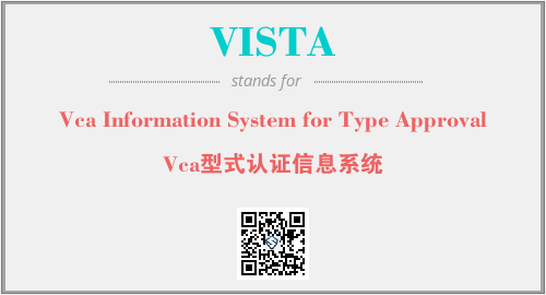 上述内容是“Vca Information System for Type Approval”作为“VISTA”的缩写,解释为“Vca型式认证信息系统”时的信息,以及英文缩略词VISTA所代表的英文单词,其对应的中文拼音、详细解释以及在英文中的流行度和相关分类、应用领域及应用示例等。
