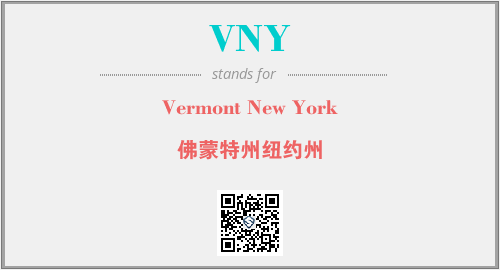 上述内容是“Vermont New York”作为“VNY”的缩写,解释为“佛蒙特州纽约州”时的信息,以及英文缩略词VNY所代表的英文单词,其对应的中文拼音、详细解释以及在英文中的流行度和相关分类、应用领域及应用示例等。