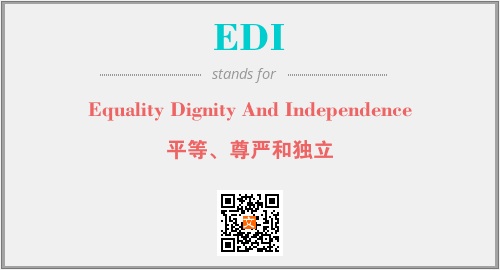 上述内容是“Equality Dignity And Independence”作为“EDI”的缩写,解释为“平等、尊严和独立”时的信息,以及英文缩略词EDI所代表的英文单词,其对应的中文拼音、详细解释以及在英文中的流行度和相关分类、应用领域及应用示例等。
