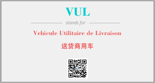 上述内容是“Vehicule Utilitaire de Livraison”作为“VUL”的缩写,解释为“送货商用车”时的信息,以及英文缩略词VUL所代表的英文单词,其对应的中文拼音、详细解释以及在英文中的流行度和相关分类、应用领域及应用示例等。