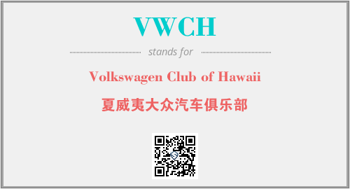 英文缩略词“VWCH”经常作为“Volkswagen Club of Hawaii”的英文缩写来使用,中文表示:“夏威夷大众汽车俱乐部”。本文将详细介绍英文缩写词VWCH所代表英文单词,其对应的中文拼音、详细解释以及在英语中的流行度。此外,还有关于缩略词VWCH的分类、应用领域及相关应用示例等。
