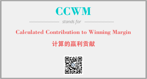 上述内容是“Calculated Contribution to Winning Margin”作为“CCWM”的缩写,解释为“计算的赢利贡献”时的信息,以及英文缩略词CCWM所代表的英文单词,其对应的中文拼音、详细解释以及在英文中的流行度和相关分类、应用领域及应用示例等。