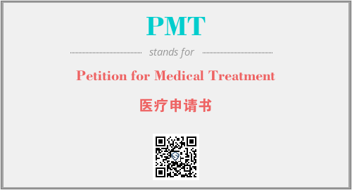以上为Petition for Medical Treatment英文缩略词PMT的中文解释,以及该英文缩写在英语的流行度、分类和应用领域方面的信息。