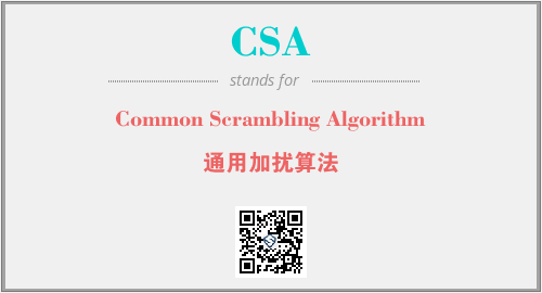 英文缩略词“CSA”经常作为“Common Scrambling Algorithm”的英文缩写来使用,中文表示:“通用加扰算法”。本文将详细介绍英文缩写词CSA所代表英文单词,其对应的中文拼音、详细解释以及在英语中的流行度。此外,还有关于缩略词CSA的分类、应用领域及相关应用示例等。
