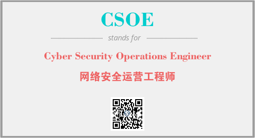 上述内容是“Cyber Security Operations Engineer”作为“CSOE”的缩写,解释为“网络安全运营工程师”时的信息,以及英文缩略词CSOE所代表的英文单词,其对应的中文拼音、详细解释以及在英文中的流行度和相关分类、应用领域及应用示例等。