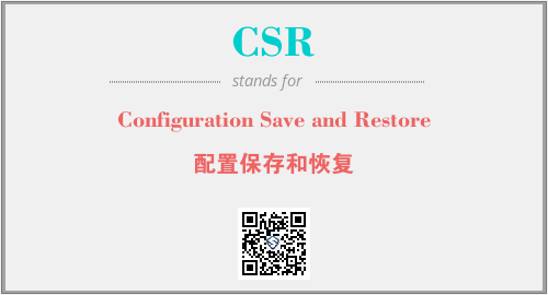 英文缩略词“CSR”经常作为“Configuration Save and Restore”的英文缩写来使用,中文表示:“配置保存和恢复”。本文将详细介绍英文缩写词CSR所代表英文单词,其对应的中文拼音、详细解释以及在英语中的流行度。此外,还有关于缩略词CSR的分类、应用领域及相关应用示例等。