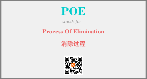 英文缩略词“POE”经常作为“Process Of Elimination”的英文缩写来使用,中文表示:“消除过程”。本文将详细介绍英文缩写词POE所代表英文单词,其对应的中文拼音、详细解释以及在英语中的流行度。此外,还有关于缩略词POE的分类、应用领域及相关应用示例等。