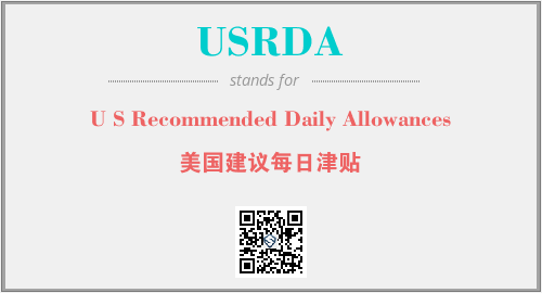 上述内容是“U S Recommended Daily Allowances”作为“USRDA”的缩写,解释为“美国建议每日津贴”时的信息,以及英文缩略词USRDA所代表的英文单词,其对应的中文拼音、详细解释以及在英文中的流行度和相关分类、应用领域及应用示例等。