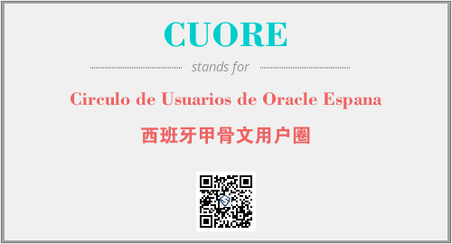 英文缩略词“CUORE”经常作为“Circulo de Usuarios de Oracle Espana”的英文缩写来使用,中文表示:“西班牙甲骨文用户圈”。本文将详细介绍英文缩写词CUORE所代表英文单词,其对应的中文拼音、详细解释以及在英语中的流行度。此外,还有关于缩略词CUORE的分类、应用领域及相关应用示例等。