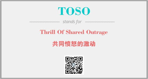 上述内容是“Thrill Of Shared Outrage”作为“TOSO”的缩写,解释为“共同愤怒的激动”时的信息,以及英文缩略词TOSO所代表的英文单词,其对应的中文拼音、详细解释以及在英文中的流行度和相关分类、应用领域及应用示例等。