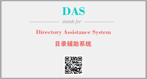 上述内容是“Directory Assistance System”作为“DAS”的缩写,解释为“目录辅助系统”时的信息,以及英文缩略词DAS所代表的英文单词,其对应的中文拼音、详细解释以及在英文中的流行度和相关分类、应用领域及应用示例等。