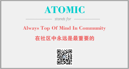 上述内容是“Always Top Of Mind In Community”作为“ATOMIC”的缩写,解释为“在社区中永远是最重要的”时的信息,以及英文缩略词ATOMIC所代表的英文单词,其对应的中文拼音、详细解释以及在英文中的流行度和相关分类、应用领域及应用示例等。