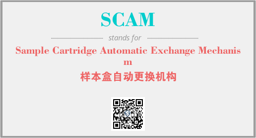 上述内容是“Sample Cartridge Automatic Exchange Mechanism”作为“SCAM”的缩写,解释为“样本盒自动更换机构”时的信息,以及英文缩略词SCAM所代表的英文单词,其对应的中文拼音、详细解释以及在英文中的流行度和相关分类、应用领域及应用示例等。