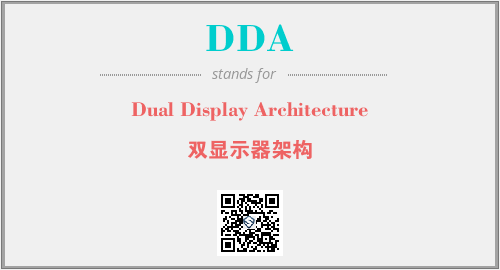 英文缩略词“DDA”经常作为“Dual Display Architecture”的英文缩写来使用,中文表示:“双显示器架构”。本文将详细介绍英文缩写词DDA所代表英文单词,其对应的中文拼音、详细解释以及在英语中的流行度。此外,还有关于缩略词DDA的分类、应用领域及相关应用示例等。