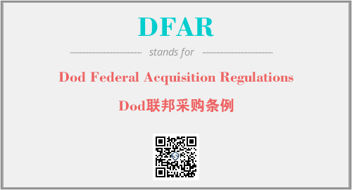 英文缩略词“DFAR”经常作为“Dod Federal Acquisition Regulations”的英文缩写来使用,中文表示:“Dod联邦采购条例”。本文将详细介绍英文缩写词DFAR所代表英文单词,其对应的中文拼音、详细解释以及在英语中的流行度。此外,还有关于缩略词DFAR的分类、应用领域及相关应用示例等。