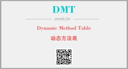 英文缩略词“DMT”经常作为“Dynamic Method Table”的英文缩写来使用,中文表示:“动态方法表”。本文将详细介绍英文缩写词DMT所代表英文单词,其对应的中文拼音、详细解释以及在英语中的流行度。此外,还有关于缩略词DMT的分类、应用领域及相关应用示例等。