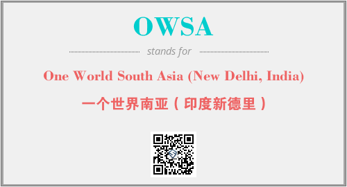 英文缩略词“OWSA”经常作为“One World South Asia (New Delhi, India)”的英文缩写来使用,中文表示:“一个世界南亚(印度新德里)”。本文将详细介绍英文缩写词OWSA所代表英文单词,其对应的中文拼音、详细解释以及在英语中的流行度。此外,还有关于缩略词OWSA的分类、应用领域及相关应用示例等。