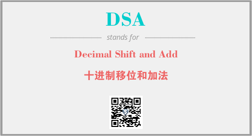 上述内容是“Decimal Shift and Add”作为“DSA”的缩写,解释为“十进制移位和加法”时的信息,以及英文缩略词DSA所代表的英文单词,其对应的中文拼音、详细解释以及在英文中的流行度和相关分类、应用领域及应用示例等。