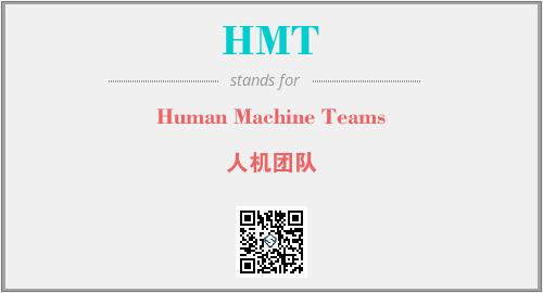 英文缩略词“HMT”经常作为“Human Machine Teams”的英文缩写来使用,中文表示:“人机团队”。本文将详细介绍英文缩写词HMT所代表英文单词,其对应的中文拼音、详细解释以及在英语中的流行度。此外,还有关于缩略词HMT的分类、应用领域及相关应用示例等。