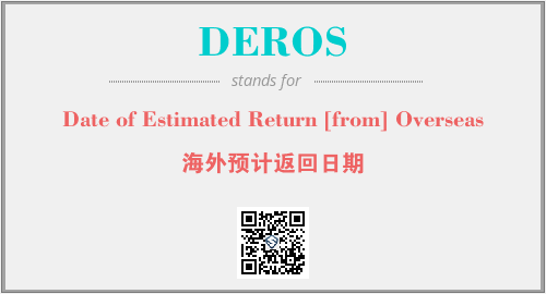 英文缩略词“DEROS”经常作为“Date of Estimated Return [from] Overseas”的英文缩写来使用,中文表示:“海外预计返回日期”。本文将详细介绍英文缩写词DEROS所代表英文单词,其对应的中文拼音、详细解释以及在英语中的流行度。此外,还有关于缩略词DEROS的分类、应用领域及相关应用示例等。