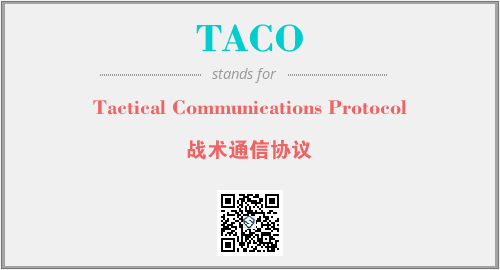 上述内容是“Tactical Communications Protocol”作为“TACO”的缩写,解释为“战术通信协议”时的信息,以及英文缩略词TACO所代表的英文单词,其对应的中文拼音、详细解释以及在英文中的流行度和相关分类、应用领域及应用示例等。