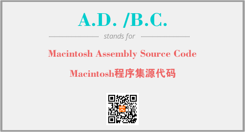 英文缩略词“A.D. /B.C.”经常作为“Macintosh Assembly Source Code”的英文缩写来使用,中文表示:“Macintosh程序集源代码”。本文将详细介绍英文缩写词A.D. /B.C.所代表英文单词,其对应的中文拼音、详细解释以及在英语中的流行度。此外,还有关于缩略词A.D. /B.C.的分类、应用领域及相关应用示例等。
