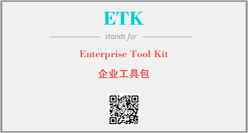 英文缩略词“ETK”经常作为“Enterprise Tool Kit”的英文缩写来使用,中文表示:“企业工具包”。本文将详细介绍英文缩写词ETK所代表英文单词,其对应的中文拼音、详细解释以及在英语中的流行度。此外,还有关于缩略词ETK的分类、应用领域及相关应用示例等。