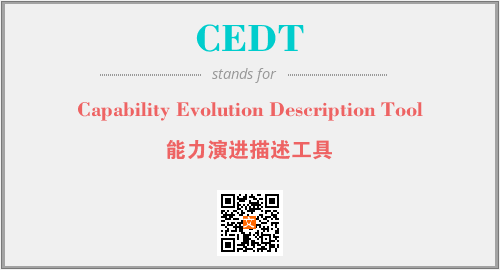 英文缩略词“CEDT”经常作为“Capability Evolution Description Tool”的英文缩写来使用,中文表示:“能力演进描述工具”。本文将详细介绍英文缩写词CEDT所代表英文单词,其对应的中文拼音、详细解释以及在英语中的流行度。此外,还有关于缩略词CEDT的分类、应用领域及相关应用示例等。