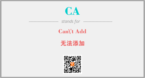 上述内容是“Can\'t Add”作为“CA”的缩写,解释为“无法添加”时的信息,以及英文缩略词CA所代表的英文单词,其对应的中文拼音、详细解释以及在英文中的流行度和相关分类、应用领域及应用示例等。