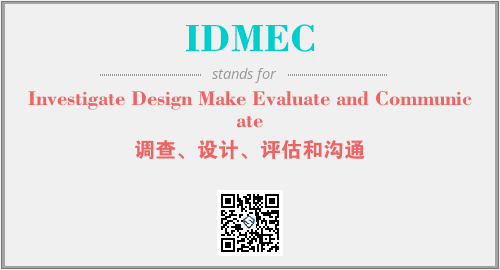 上述内容是“Investigate Design Make Evaluate and Communicate”作为“IDMEC”的缩写,解释为“调查、设计、评估和沟通”时的信息,以及英文缩略词IDMEC所代表的英文单词,其对应的中文拼音、详细解释以及在英文中的流行度和相关分类、应用领域及应用示例等。
