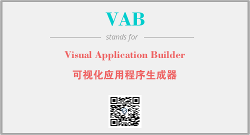 英文缩略词“VAB”经常作为“Visual Application Builder”的英文缩写来使用,中文表示:“可视化应用程序生成器”。本文将详细介绍英文缩写词VAB所代表英文单词,其对应的中文拼音、详细解释以及在英语中的流行度。此外,还有关于缩略词VAB的分类、应用领域及相关应用示例等。