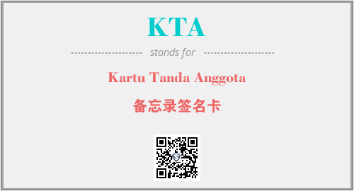 英文缩略词“KTA”经常作为“Kartu Tanda Anggota”的英文缩写来使用,中文表示:“备忘录签名卡”。本文将详细介绍英文缩写词KTA所代表英文单词,其对应的中文拼音、详细解释以及在英语中的流行度。此外,还有关于缩略词KTA的分类、应用领域及相关应用示例等。