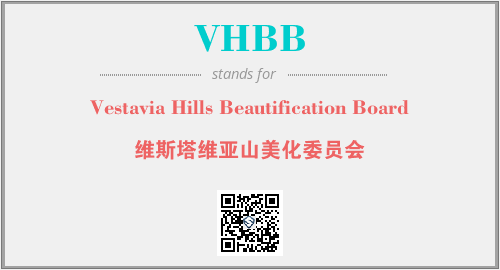 上述内容是“Vestavia Hills Beautification Board”作为“VHBB”的缩写,解释为“维斯塔维亚山美化委员会”时的信息,以及英文缩略词VHBB所代表的英文单词,其对应的中文拼音、详细解释以及在英文中的流行度和相关分类、应用领域及应用示例等。