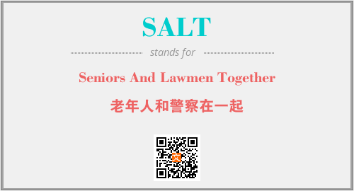 上述内容是“Seniors And Lawmen Together”作为“SALT”的缩写,解释为“老年人和警察在一起”时的信息,以及英文缩略词SALT所代表的英文单词,其对应的中文拼音、详细解释以及在英文中的流行度和相关分类、应用领域及应用示例等。