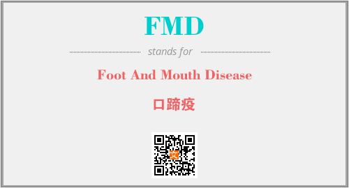上述内容是“Foot And Mouth Disease”作为“FMD”的缩写,解释为“口蹄疫”时的信息,以及英文缩略词FMD所代表的英文单词,其对应的中文拼音、详细解释以及在英文中的流行度和相关分类、应用领域及应用示例等。