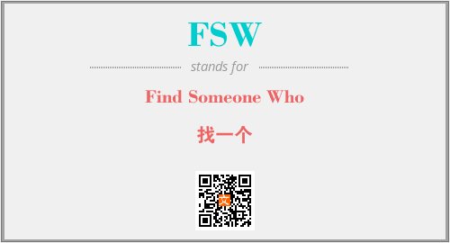 上述内容是“Find Someone Who”作为“FSW”的缩写,解释为“找一个”时的信息,以及英文缩略词FSW所代表的英文单词,其对应的中文拼音、详细解释以及在英文中的流行度和相关分类、应用领域及应用示例等。