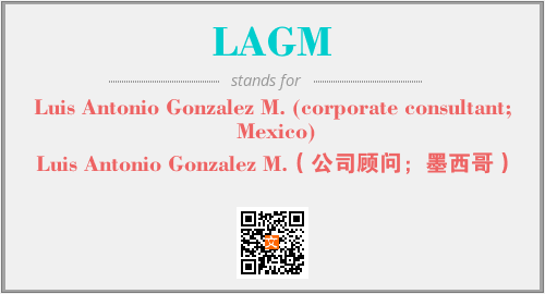 上述内容是“Luis Antonio Gonzalez M. (corporate consultant; Mexico)”作为“LAGM”的缩写,解释为“Luis Antonio Gonzalez M.(公司顾问;墨西哥)”时的信息,以及英文缩略词LAGM所代表的英文单词,其对应的中文拼音、详细解释以及在英文中的流行度和相关分类、应用领域及应用示例等。