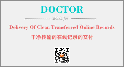 上述内容是“Delivery Of Clean Transferred Online Records”作为“DOCTOR”的缩写,解释为“干净传输的在线记录的交付”时的信息,以及英文缩略词DOCTOR所代表的英文单词,其对应的中文拼音、详细解释以及在英文中的流行度和相关分类、应用领域及应用示例等。