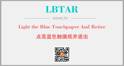 上述内容是“Light the Blue Touchpaper And Retire”作为“LBTAR”的缩写,解释为“点亮蓝色触摸纸并退出”时的信息,以及英文缩略词LBTAR所代表的英文单词,其对应的中文拼音、详细解释以及在英文中的流行度和相关分类、应用领域及应用示例等。