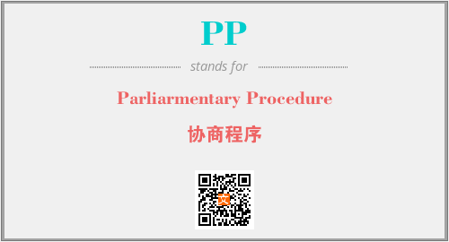 上述内容是“Parliarmentary Procedure”作为“PP”的缩写,解释为“协商程序”时的信息,以及英文缩略词PP所代表的英文单词,其对应的中文拼音、详细解释以及在英文中的流行度和相关分类、应用领域及应用示例等。