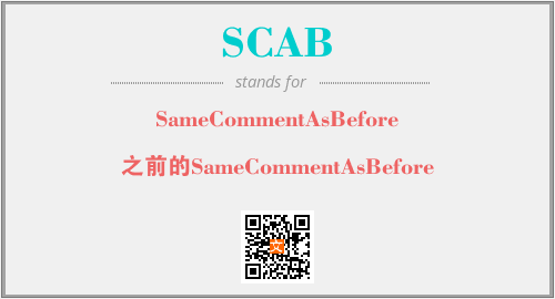 上述内容是“SameCommentAsBefore”作为“SCAB”的缩写,解释为“之前的SameCommentAsBefore”时的信息,以及英文缩略词SCAB所代表的英文单词,其对应的中文拼音、详细解释以及在英文中的流行度和相关分类、应用领域及应用示例等。