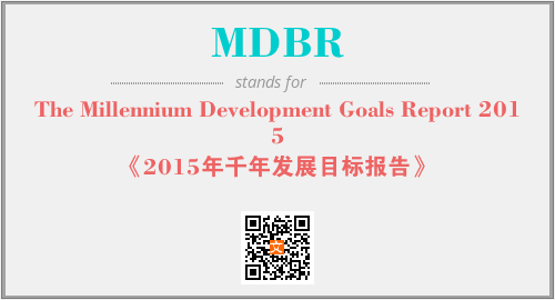 上述内容是“The Millennium Development Goals Report 2015”作为“MDBR”的缩写,解释为“《2015年千年发展目标报告》”时的信息,以及英文缩略词MDBR所代表的英文单词,其对应的中文拼音、详细解释以及在英文中的流行度和相关分类、应用领域及应用示例等。