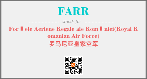 上述内容是“Forţele Aeriene Regale ale României(Royal Romanian Air Force)”作为“FARR”的缩写,解释为“罗马尼亚皇家空军”时的信息,以及英文缩略词FARR所代表的英文单词,其对应的中文拼音、详细解释以及在英文中的流行度和相关分类、应用领域及应用示例等。