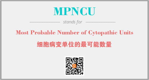 英文缩略词“MPNCU”经常作为“Most Probable Number of Cytopathic Units”的英文缩写来使用,中文表示:“细胞病变单位的最可能数量”。本文将详细介绍英文缩写词MPNCU所代表英文单词,其对应的中文拼音、详细解释以及在英语中的流行度。此外,还有关于缩略词MPNCU的分类、应用领域及相关应用示例等。
